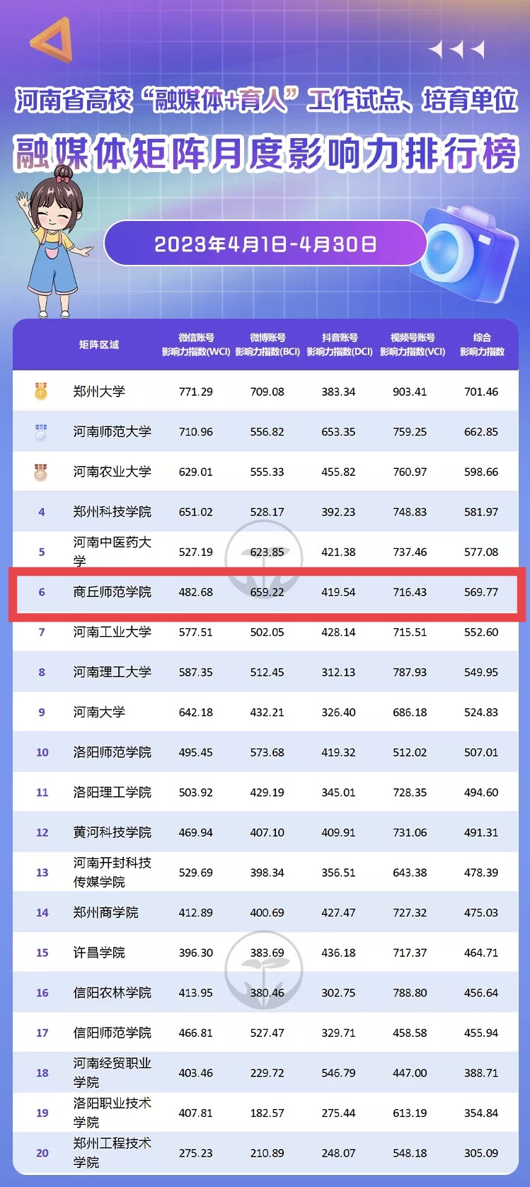 近日,在河南省教育厅公布的河南省高校“融媒体+育人”工作试点、培育单位融媒体矩阵影响力排行榜中,威尼斯官网综合影响力居第六位。融媒体矩阵月度影响力排行榜综合各高校微信、微博、抖音和视频号影响力指数,其中,威尼斯官网微博影响力指数居第二位,成绩显著。