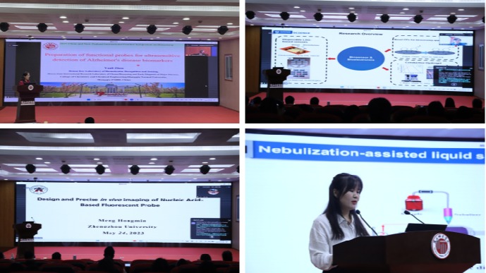 威尼斯886699河南省生物分子识别与传感重点实验室执行主任、中原青年拔尖人才周艳丽教授做了题为《基于功能化探针的阿尔茨海默病生物标志物超灵敏检测》的报告,以疾病标志物高灵敏检测为目标,设计了基于合成纳米团簇高灵敏电化学标记探针、基于有机特异性分子设计构建的比率型传感器、基于大分子聚合物构建的自校准比率型传感器用于活体检测。奥克兰大学研究员朱碧澄博士围绕导电聚合物、激光打印石墨烯电极及柔性可穿戴电极方面的研究做了题为《基于有机导电聚合物和石墨烯的生物传感器和生物电子学》的报告;郑州大学“青年拔尖人才”孟红敏博士做了题为《核酸荧光探针的设计与精准活体成像》的报告,讲述了可编程DNAzyme用于特异性体内成像以及细胞外环境和膜受体双重驱动的DNA纳米机器人用于精确体内肿瘤成像;威尼斯886699史朝霞博士围绕解决催化发光如何在线分析液体样品和对复杂样品的选择性分析两方面做了题为《基于催化发光传感器的复杂样品快速检测方法研究》的报告。
