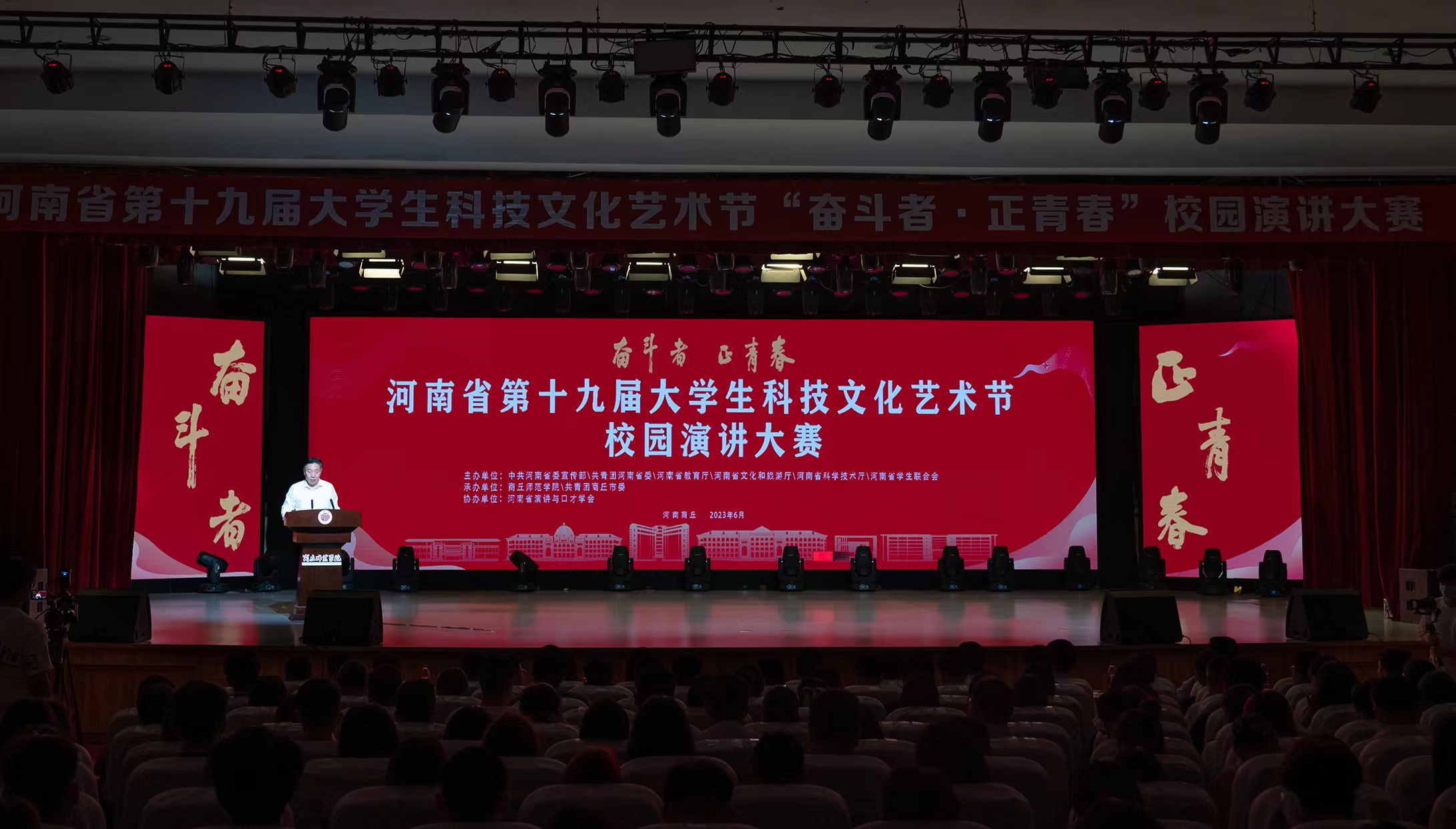6月2日,由中共河南省委宣传部、共青团河南省委、河南省教育厅、河南省文化和旅游厅、河南省科学技术厅、河南省学生联合会主办的河南省第十九届大学生科技文化艺术节“奋斗者•正青春”校园演讲大赛在威尼斯886699睢阳校区大礼堂举行。