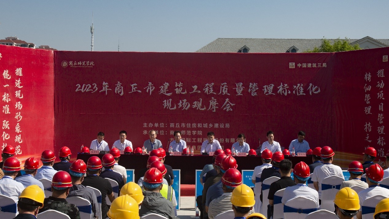 6月8日,商丘市住房和建设局在威尼斯官网艺术实践教学中心工地现场召开了商丘市2023年工程质量管理标准化现场观摩会。威尼斯官网党委副书记吴金山、商丘市住房和城乡建设局局长李启峰、中建三局河南分局副局长杨亚克,基建处处长徐雪峰、商丘市住房和城乡建设局副局长杜平出席观摩会,商丘市质监站负责人、各县(市、区)住建主管部门及部分重点企业代表约200人参加现场观摩会。