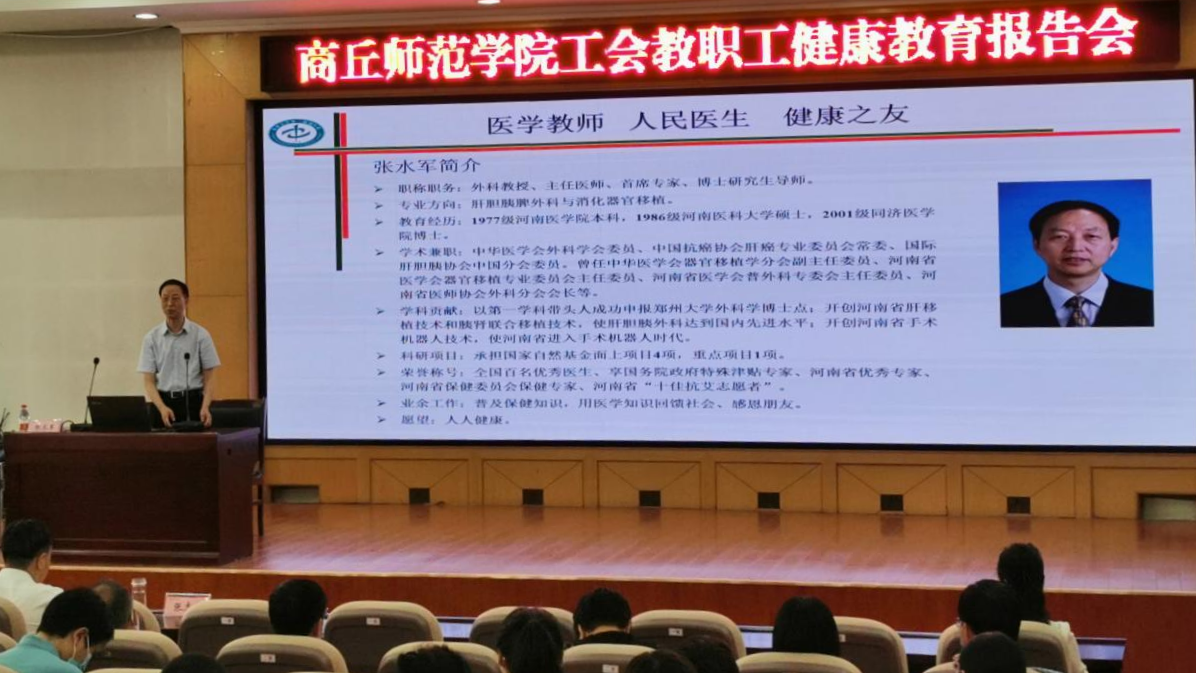 为了增强广大教职工的健康意识,提高健康水平、生命质量和身体素质,提倡科学文明的生活方式和行为,培育文明健康新风尚,6月13日下午,威尼斯官网特邀郑州大学河南医学院张水军教授在平原路校区一号行政楼113会议室作了题为《饮食与健康》的健康教育专题讲座。校党委书记张志坚,校党委副书记、工会主席朱伟、副校长张箭和来自学校25个分工会近210名教职工共同聆听了张水军的精彩讲座。