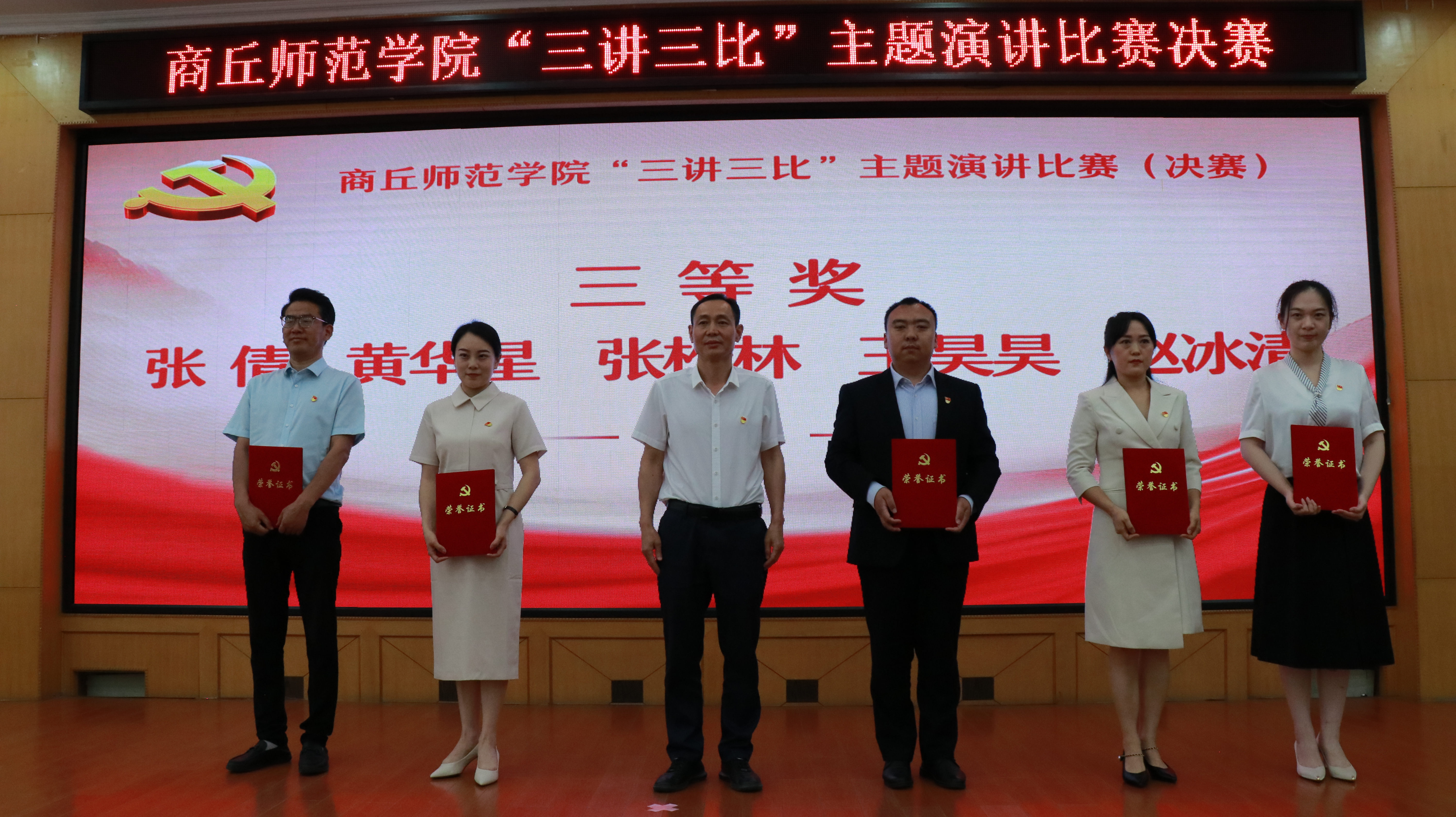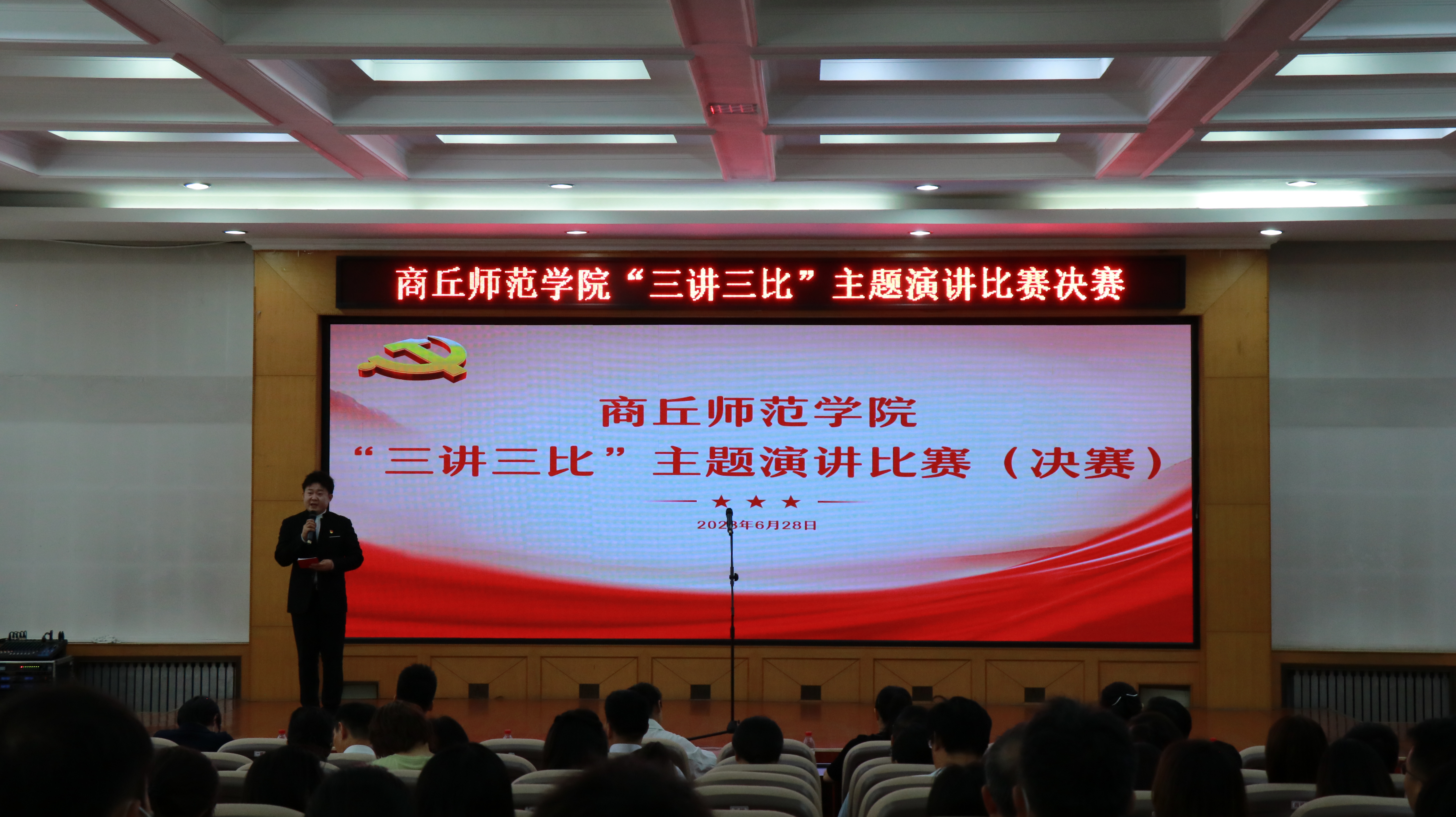 在喜迎中国共产党诞辰102周年之际,以“讲学习比党性、讲创新比业绩、讲作风比实效”为主题的“三讲三比”演讲比赛决赛,于6月28日下午,在梁园校区归德楼113举行。校党委副书记吴金山,副校长程功鹏、张箭出席比赛并颁奖。本着公开、公平、公正的原则,邀请商丘广播电视台副台长、高级编辑汪娜,市委宣传部电影科四级主任科员姬冰洁,国家级普通话测试员、商丘职业技术学院副教授孙媛媛,商丘广播电视914新闻广播总监、主任编辑袁媛,商丘广播电视台1007交通广播主播王晓龙担任本次比赛评委。