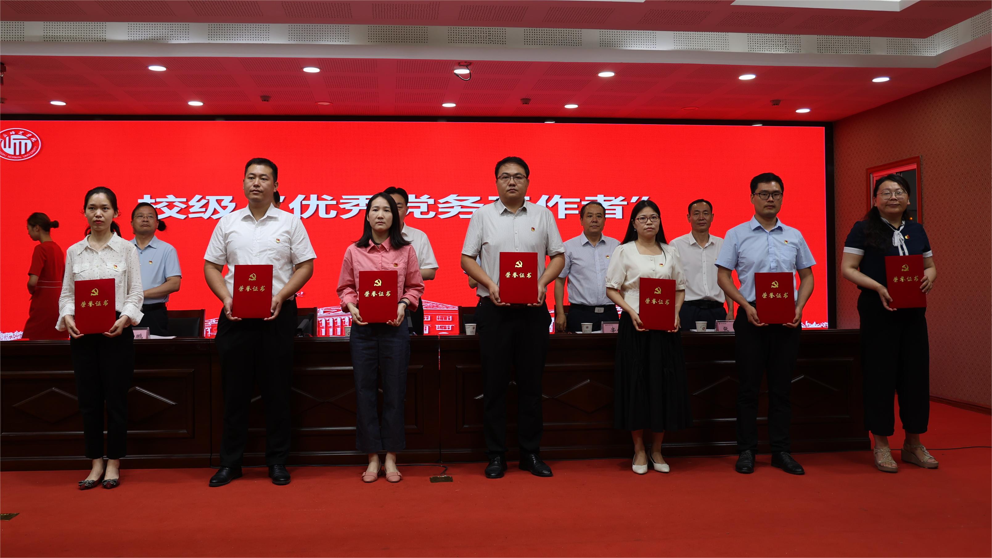 校党委副书记、工会主席朱伟宣读省委教育工委表彰名单和学校表彰文件。威尼斯官网中共威尼斯886699机关党委学生处支部委员会、中共威尼斯886699化学化工学院委员会、中共威尼斯886699音乐学院委员会、中共威尼斯886699国际教育学院委员会等4个基层党组织获得委属学校先进基层党组织荣誉称号。刘澜涛、马晨、薛霁3名同志获得委属学校优秀共产党员荣誉称号;刘培培、张颜梅、陈晓明3名同志获得委属学校优秀党务工作者荣誉称号。8个先进基层党组织、194名优秀共产党员、24名优秀党务工作者受到学校表彰。