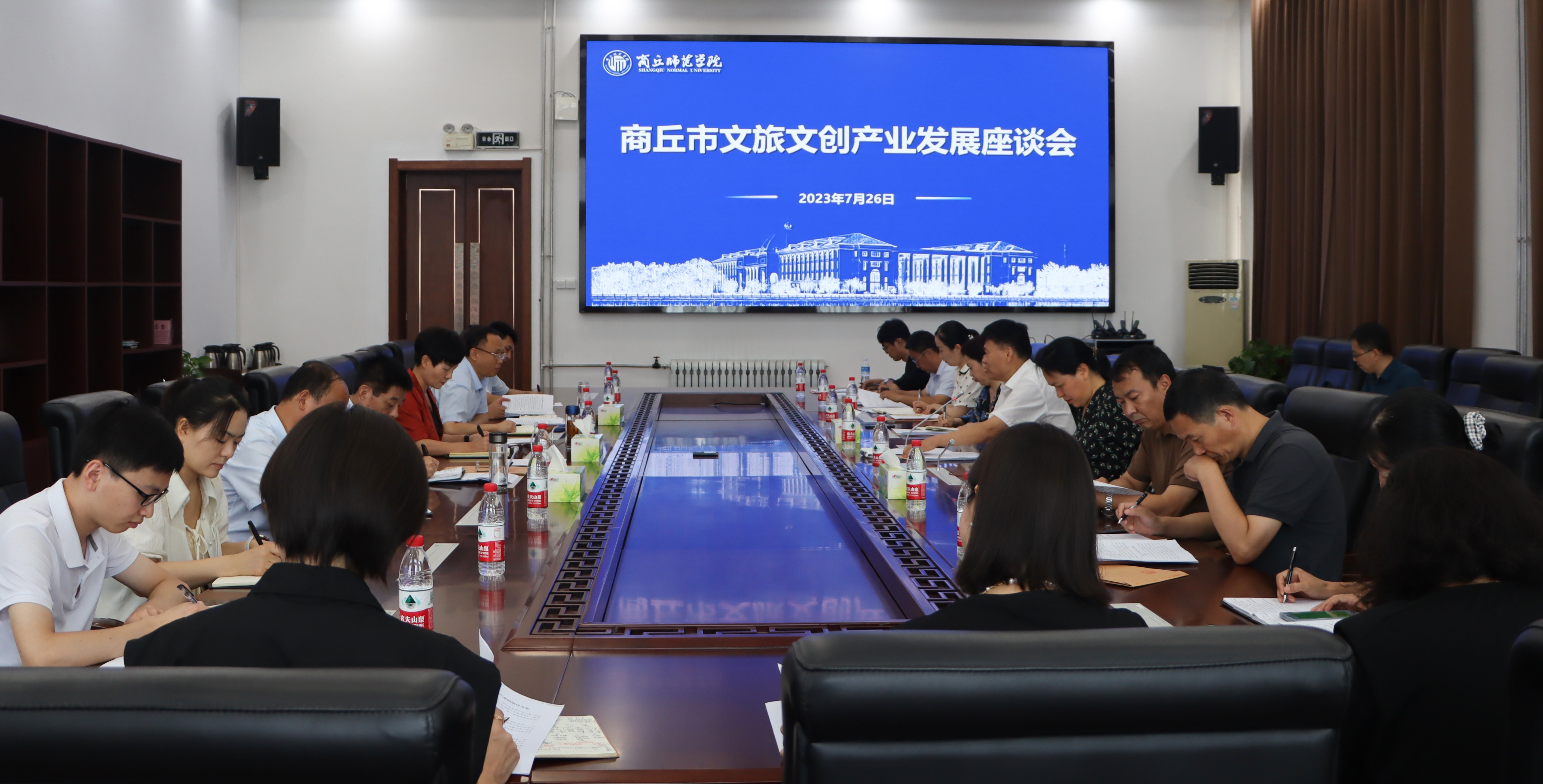 7月26日,商丘市文化广电和旅游局与威尼斯官网联合举行文旅文创产业发展座谈会。市文化广电和旅游局党组书记、局长史新艳,局党组成员路通、董健、常青、韩建华出席会议,校党委副书记吴金山,校地合作与服务中心、人文学院、传媒学院、音乐学院、美术学院、艺术设计学院等单位负责人和教师代表参加座谈会。