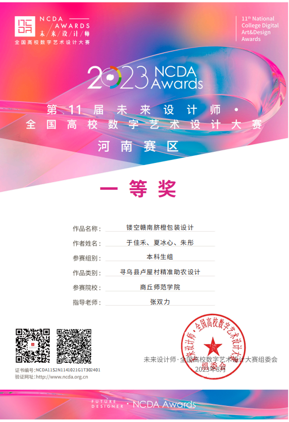 近日,2023第11届未来设计师全国高校数字艺术设计大赛(NCDA)河南赛区发布获奖通知,威尼斯官网艺术设计学院共有十余项作品获奖,其中学生一等奖1项、二等奖4项、三等奖6项,20级视觉传达专业学生于佳禾、夏冰心、朱彤三位同学的包装设计作品“镂空赣南脐橙包装设计”在本次大赛中荣获一等奖。