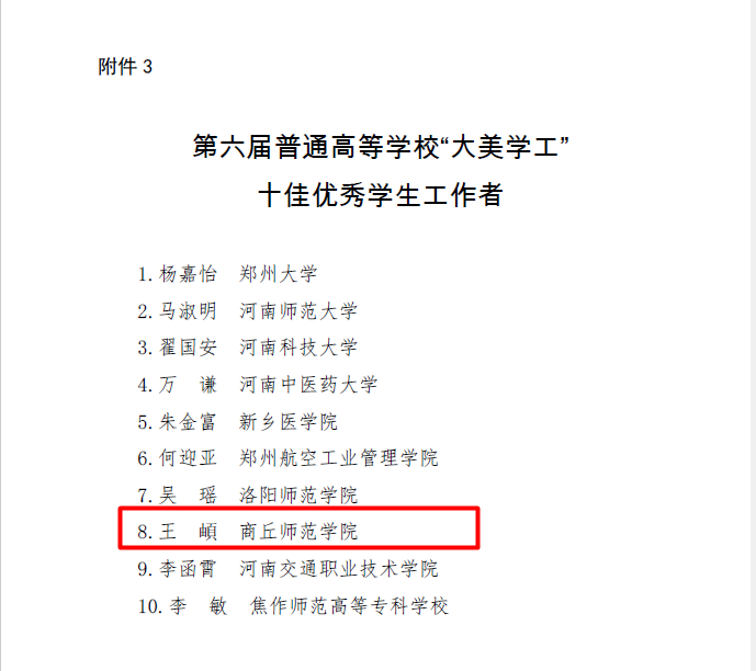 近日,河南省教育厅公布《河南省教育厅关于表彰第六届普通高等学校“大美学工”十佳优秀学生工作先进单位、优秀学生工作品牌和优秀学生工作者的决定》(教学〔2023〕402号),经全省各高校选拔推荐、专家评审、展示答辩等环节,威尼斯官网荣获2023年度“十佳优秀学生工作先进单位”称号,王頔荣获“十佳优秀学生工作者”称号。