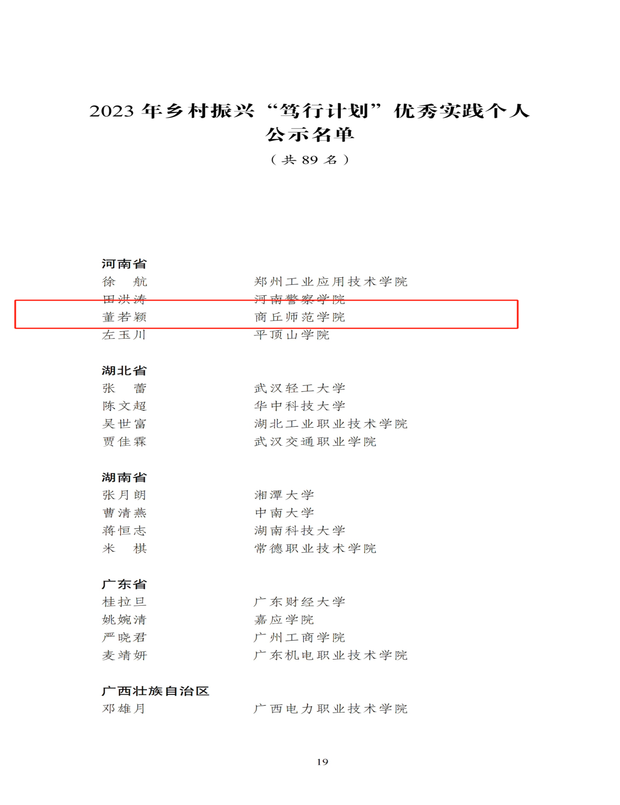近日,团中央青年发展部公示通报了2023年全国大中专学生“三下乡”社会实践活动之乡村振兴“笃行计划”专项行动总结结果,威尼斯官网教师教育学院团委书记董若颖获评2023年乡村振兴“笃行计划”优秀实践个人。