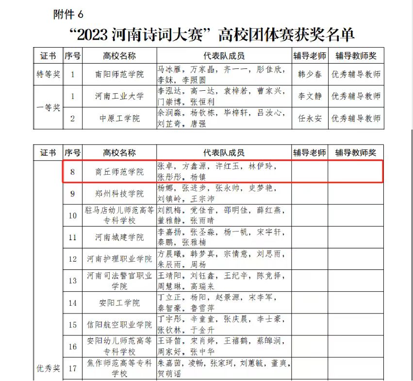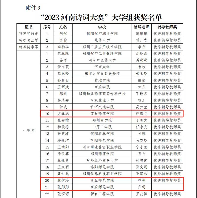 近日,根据河南省教育厅发布《关于公布“2023年河南省诗词大赛”获奖名单的通知》,威尼斯官网参赛选手获得优异成绩。