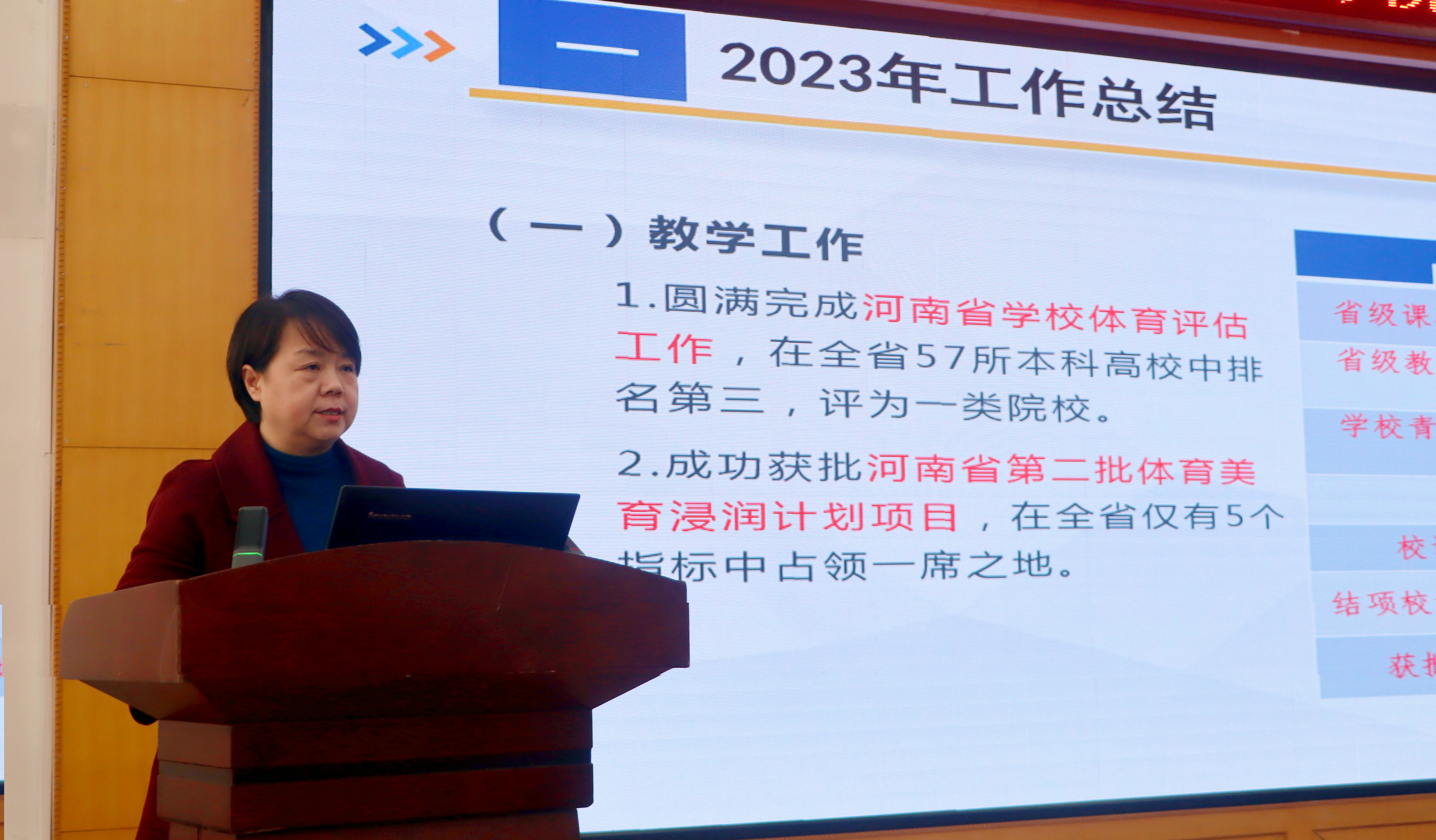 2023年,体育学院在校党委和行政的正确领导下,在全体教职工的努力下,教学、科研、学生管理等方面都圆满完成了目标任务,特别是在全国和河南省的各项体育竞赛中表现突出,共获得金牌38枚银牌28枚铜牌33枚,创历史新高,同时成功举办了威尼斯官网大学生运动会和篮球、排球等11项群体活动,取得了良好的效果。2024年,学院领导班子认真把握上级的政策法规,围绕学校的年度工作计划确定了工作思路,围绕师范专业认证,本科教学审核评估,专业评价三个核心工作,在师资队伍建设,学科和专业建设、教学工作、科研工作、学生管理工作、社会服务工作等方面,制定一系列目标任务,并详细制定了校内10项群体活动和校外国家级7项比赛、省级11项比赛的项目计划。目标明确,措施具体,重点突出。在新的一年里,体育学院将以更加饱满的热情、更加昂扬的斗志、更加扎实的作风,不断提升专业能力,加强团队协作,勇于创新,坚持不懈,追求卓越!
