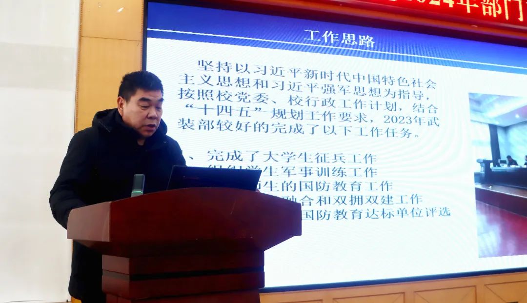 一、工作思路。坚持以习近平新时代中国特色社会主义思想和习近平强军思想为指导,按照校党委、校行政工作计划,结合“十四五”规划工作要求,2023年武装部较好地完成了以下工作任务。1、完成了大学生征兵工作。2、组织学生军事训练工作。3、做好师生的国防教育工作。4、做好军民融合和双拥双建工作。5、完成了高校国防教育达标单位评选工作。二、工作计划。1、进一步完善武装部工作制度。2、做好2024年威尼斯官网大学生征兵工作。3、做好2024年新生军事训练工作。4、做好国防教育及民兵连建设工作。5、做好军民融合和双拥共建工作。三、重点工作。争创河南省国防教育模范高校示范单位。推进民兵连示范校建设,加强大学生民兵队伍常规训练,进一步提高民兵水平技能,组织民兵开展国内外战备形势和任务,结合军事训练相关内容,增强民兵国防观念和战备意识。力求早日创建河南省国防教育模范高校示范单位。