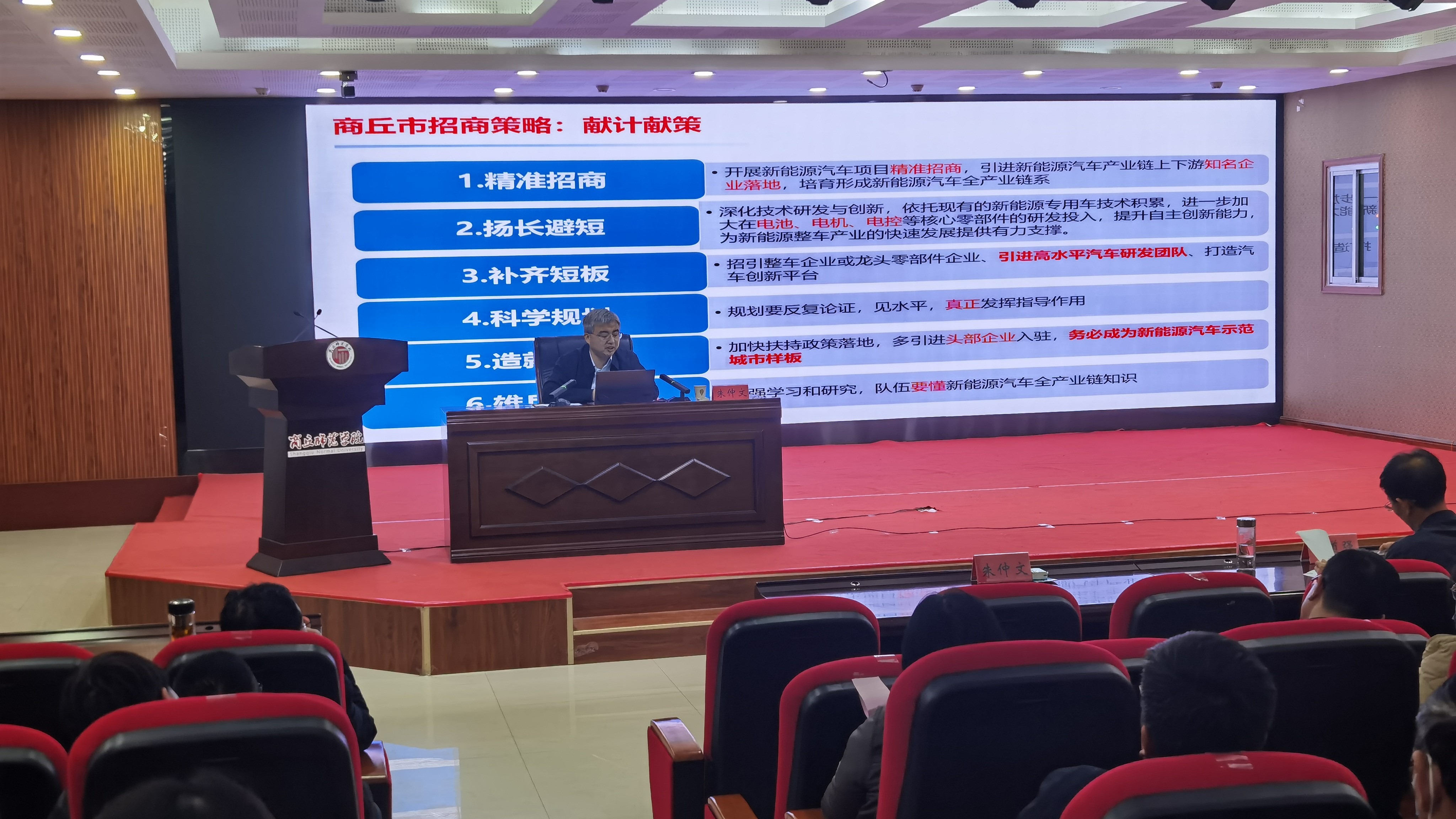 合肥工业大学汽车工程技术研究院副院长、教授级高级工程师朱仲文以《新能源汽车概论》为题,结合丰富的案例,全面分析了新能源汽车产业发展现状、关键技术、未来趋势,并结合商丘市新能源产业发展现状,对商丘市新能源汽车行业未来发展和产业布局提出了具有针对性的意见建议。