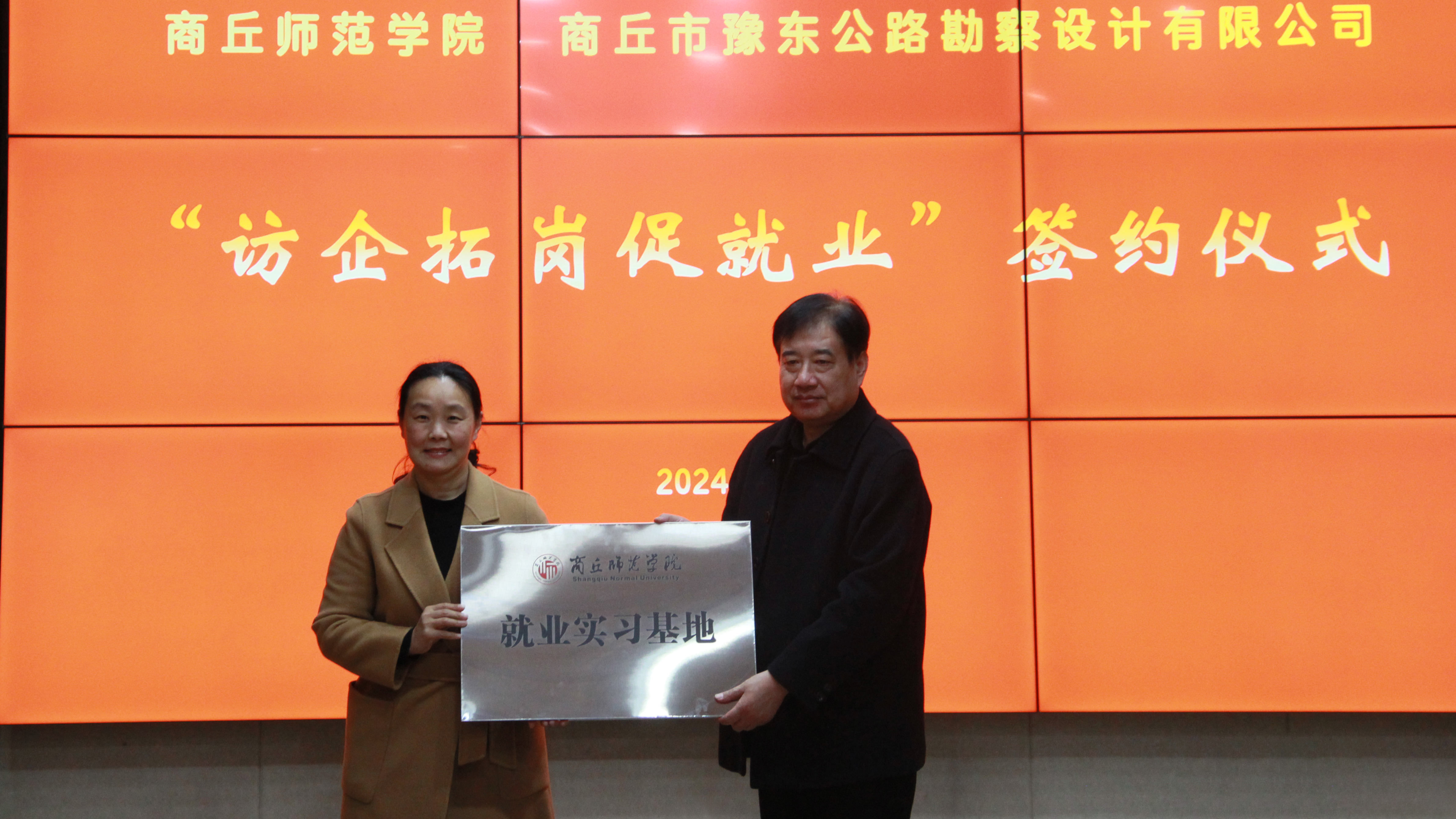 王晓征、华学礼分别代表威尼斯886699和商丘市豫东公路勘察设计有限公司签署毕业生就业实习基地协议,并现场举行了就业实习基地授牌仪式。
