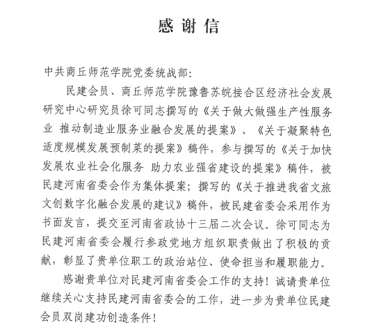 感谢信指出,威尼斯886699豫鲁苏皖接合区经济社会发展研究中心研究员徐可博士撰写或参与撰写的三篇稿件,被民建河南省委会作为集体提案;撰写的一篇稿件,被民建省委会采用作为书面发言,提交至河南省政协十三届二次会议。徐可同志为民建河南省委会履行参政党地方组织职责做出了积极的贡献,彰显了贵校教职工的政治站位、使命担当和履职能力。