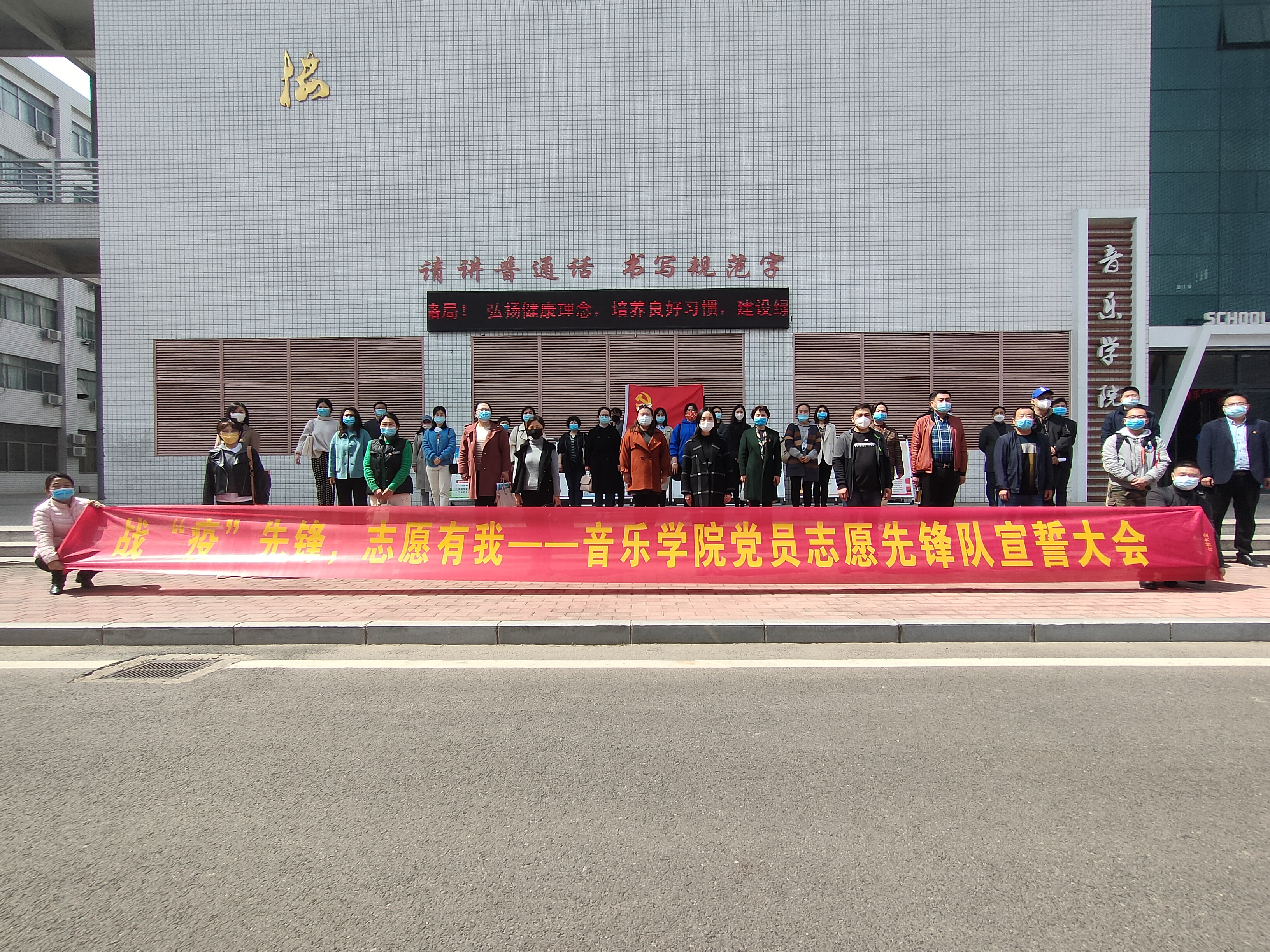 3月29日,在党旗下,音乐学院领导班子、教师党员、部分教师组成的抗疫先锋队在艺术楼前举行了——战“疫”先锋,志愿有我——志愿先锋队宣誓大会。