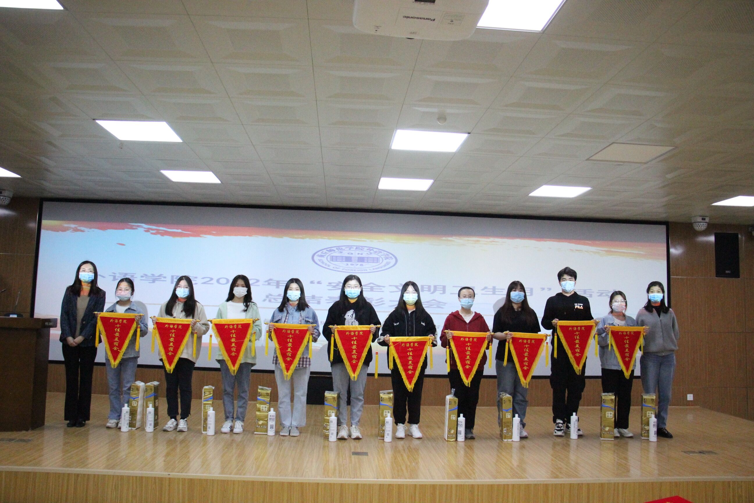 大会表彰了在“创意个性口罩,艺术点亮生活”创意口罩设计大赛、“变废为宝,绿色环保”废品回收利用活动以及“‘寓’见最美,一见钟‘寝’”最美宿舍评选活动中获奖的集体或个人。与会领导老师依次为受到表彰的同学进行了颁奖,并为“十佳最美宿舍”颁发了锦旗和奖品。王頔对“安全文明卫生月”活动的重要意义再次强调,希望同学们在今后的学习和生活中一如既往地保持安全文明卫生的良好习惯,共同创建绿色、健康、和谐的校园环境。此外倡导大家在疫情防控封闭管理期间,走下网络、走出宿舍、走向操场,加强体育锻炼,积极参加各类活动,保持积极乐观的心态和战胜疫情的信心。