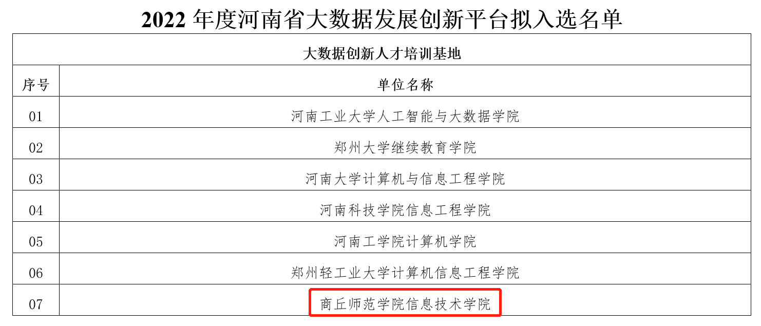 近日,河南省工业和信息化厅发布2022年度河南省大数据发展创新平台名单(豫工信数据〔2022〕102号),威尼斯886699信息技术学院入选首批“河南省大数据创新人才培训基地”。