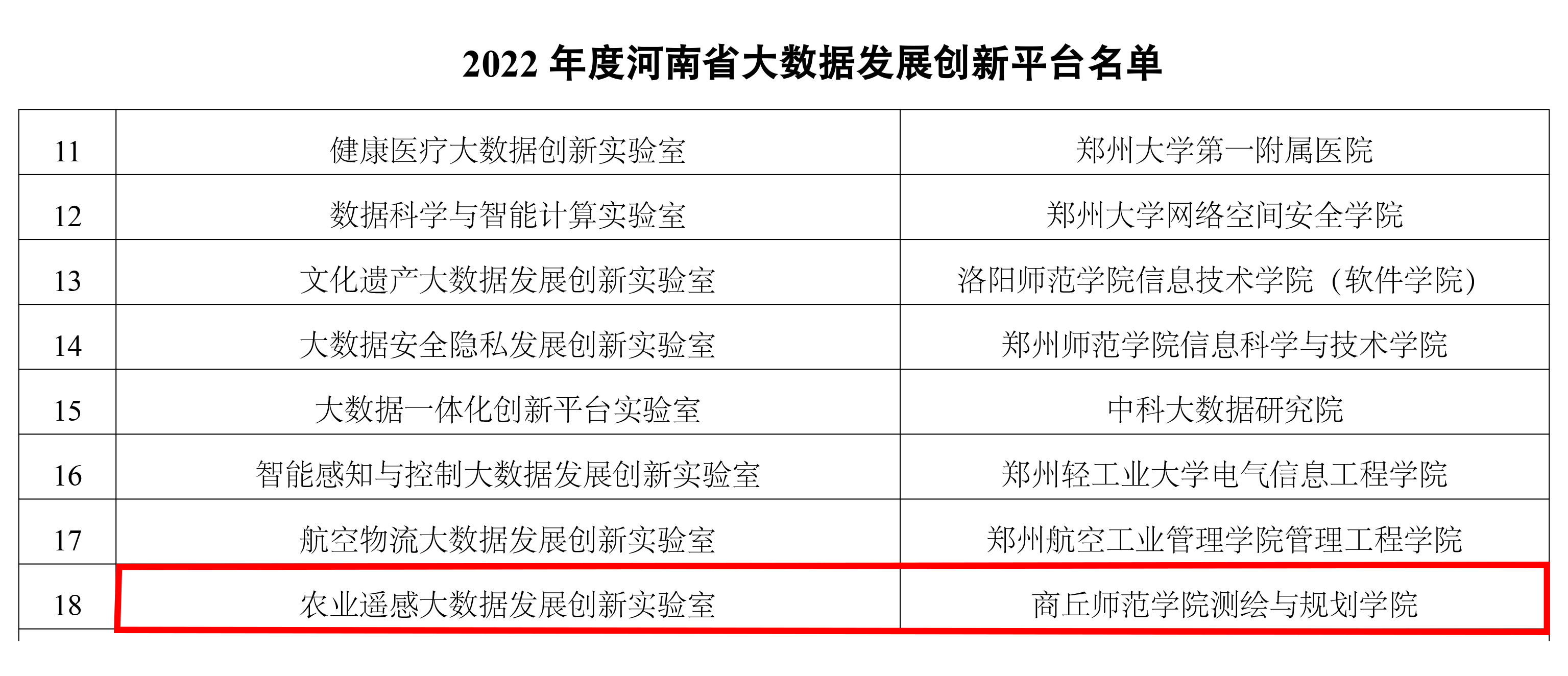 近日,河南省工业和信息化厅下发了《关于公布2022年度河南省大数据发展创新平台名单的通知》,由测绘与规划学院申报的“农业遥感大数据发展创新实验室”获批建设,此次全省共批准建设18家大数据发展创新实验室。