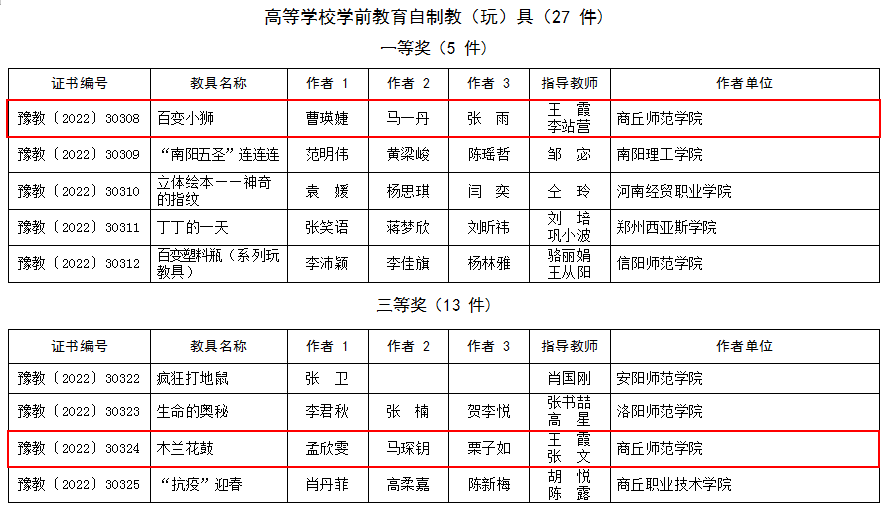 近日,河南省教育厅《关于公布第十九届河南省中小学幼儿园自制教(玩)具暨学生科技创新小制作小发明评选活动结果的通知》(教资保〔2022〕268号)下发,威尼斯官网教师教育学院学前教育专业2019级学生曹瑛婕、马一丹、张雨设计的《百变小狮》荣获一等奖,2020级学生孟欣雯、马琛玥、栗子设计的《木兰花鼓》荣获三等奖。