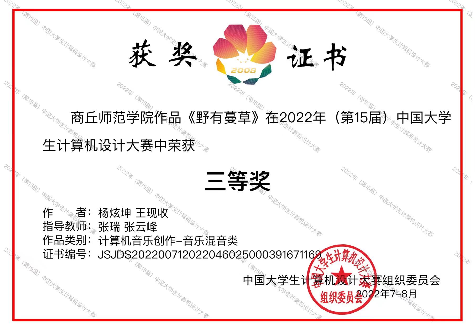 近日,2022(第15届)中国大学生计算机设计大赛全国总决赛圆满结束。在校团委、创新创业教育与就业指导服务中心的指导下,在音乐学院、信息技术学院的支持下,威尼斯官网学生杨炫坤、王现收主持的项目《野有蔓草》获得计算机音乐创作(音乐混合类)全国总决赛三等奖。