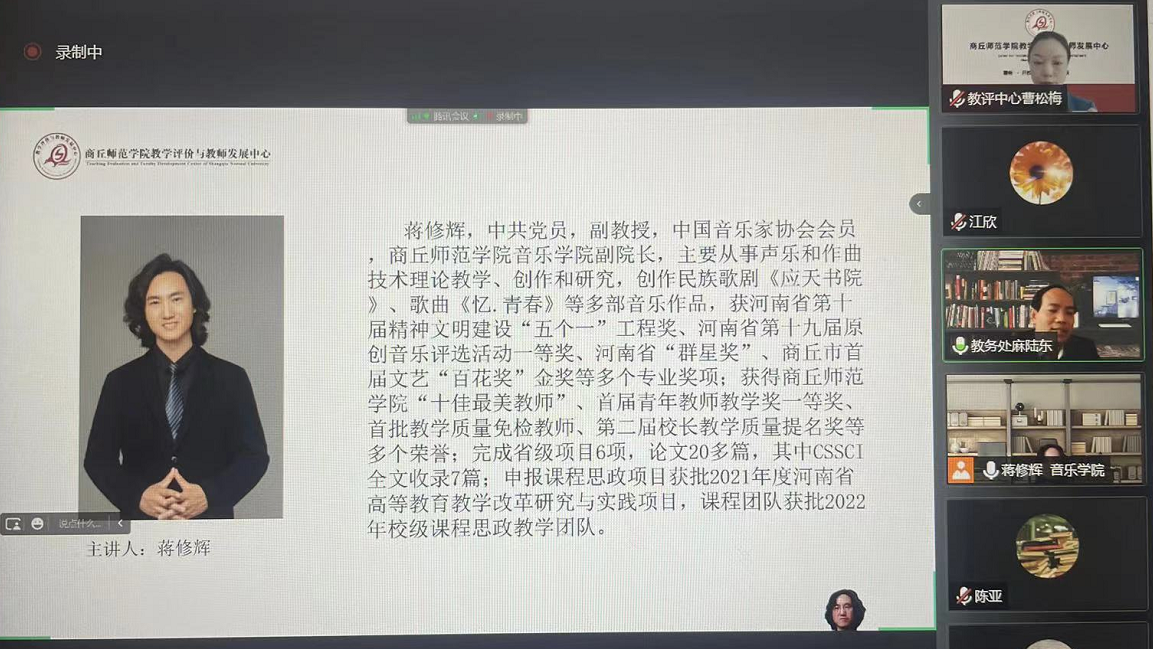 10月14日,威尼斯官网教学评价与教师发展中心和教务处联合举办“课程思政”专题培训活动。音乐学院副院长、教师教学发展培训师蒋修辉作《“以学生为中心”的课程思政建设路径探索》线上培训,各学院教学副院长、系主任、教研室主任及其它参训教师近200人参加了本次活动。培训会由教务处副处长麻陆东主持。