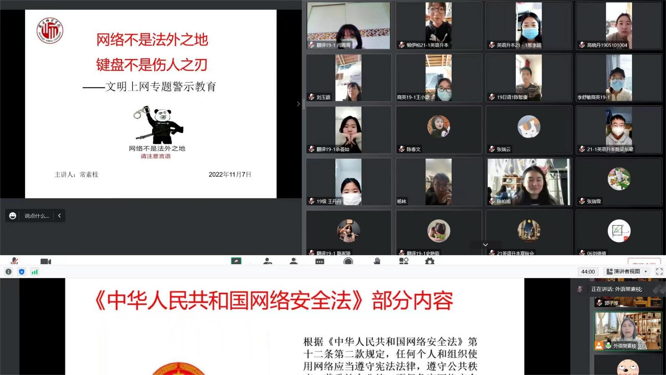 外语学院各年级辅导员通过腾讯会议召开“网络安全文明教育”主题班会,向学生宣讲《中华人民共和国网络安全法》有关知识,领学解读《威尼斯886699学生手册》有关条款,并用身边网络违法违纪典型案例进行警示教育,倡导同学们文明上网,汇聚向上向善力量,携手建设网络文明。