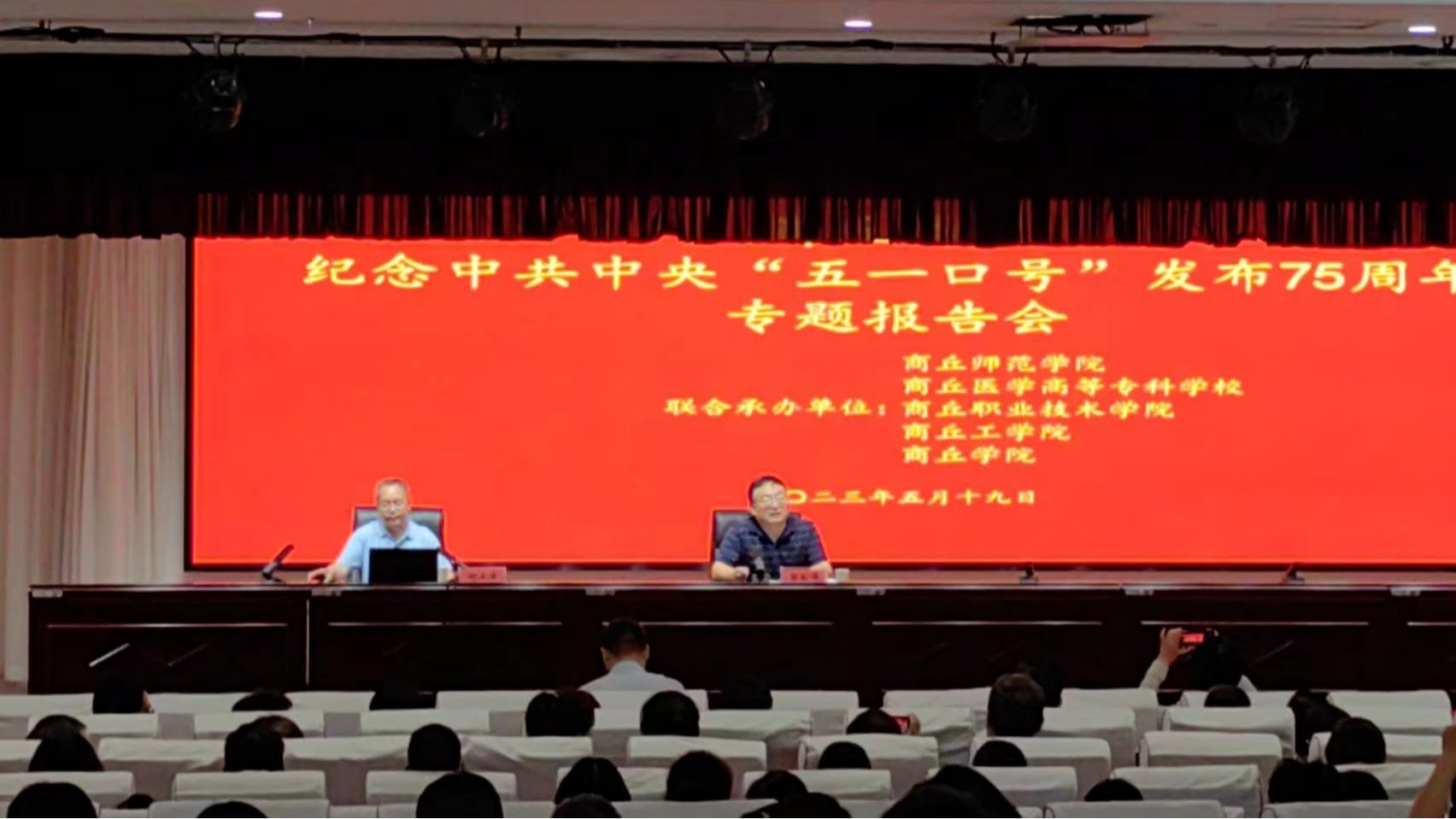 为认真贯彻落实省委教育工委、省教育厅工作部署,按照威尼斯官网纪念中共中央发布“五一口号”75周年工作安排,5月19日上午,威尼斯官网联合商丘市四所市属高校:商丘医学高等专科学校、商丘职业技术学院、商丘工学院、商丘学院,共同举办了纪念“五一口号”发布75周年专题报告会。