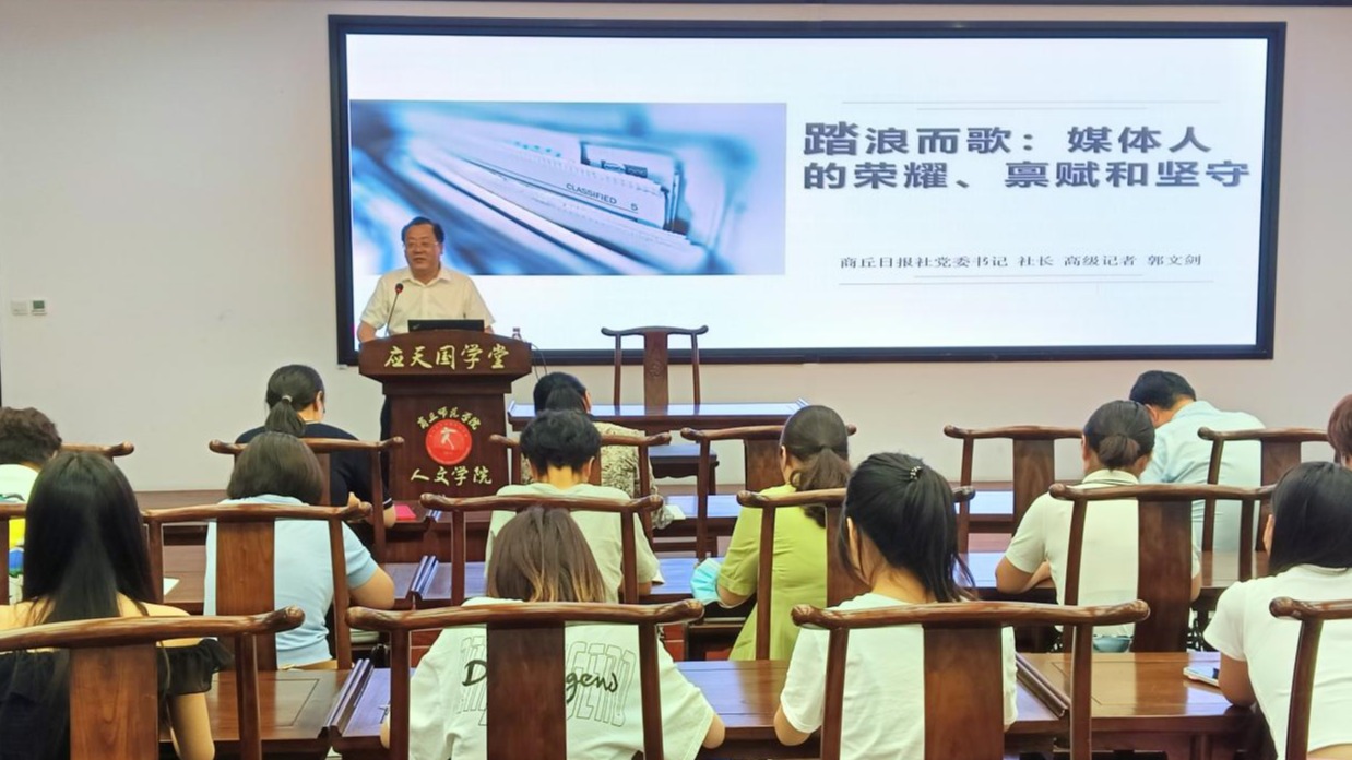 6月20日下午,威尼斯886699聘请商丘日报社社长、高级记者郭文剑为客座教授仪式在梁园校区汉梁楼国学堂举行,副校长辛作义为郭文剑颁发聘书。随后,应传媒学院之邀,郭文剑作了题为《踏浪而歌:媒体人的荣耀、禀赋和坚守》的专题讲座。传媒学院领导班子成员及传媒学院师生200余人现场聆听报告。